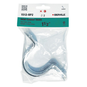 1-1/2 in. Two hole galvanized steel rigid conduit strap. Maximum conduit diameter 1.90 in. Hole size 1/4 in.