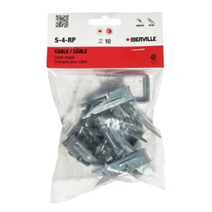 Steel cable staple. NMD90: 8/3-6/3, AC90: 14/2-8/2, 14/3-8/3, 14/4-10/4.